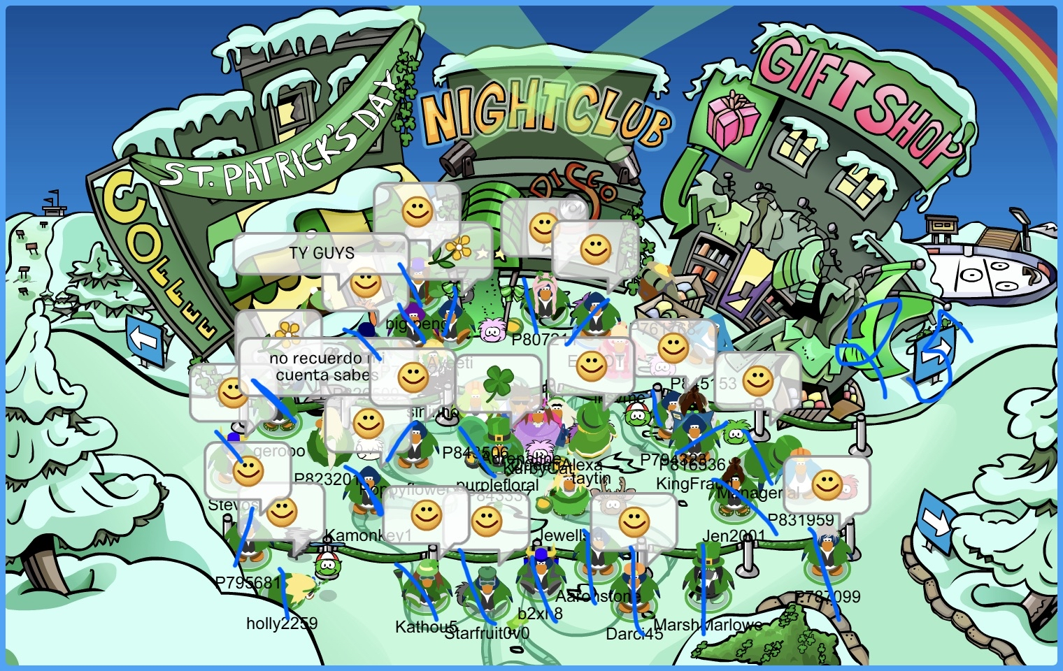 Frostbite, Water Vikings Capital — Greetings Vikings! Today, we logged onto Club Penguin Journey for an early St. Patrick’s Day celebration with our Shamrock Shuffle! We dressed up with some clovers and paraded through the Town, Snow Forts, and Night Club. Thank you to everyone who came and we can’t wait to see you for our battle this Saturday!