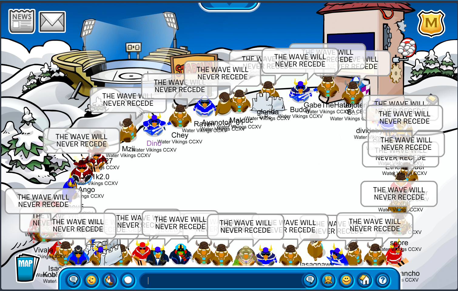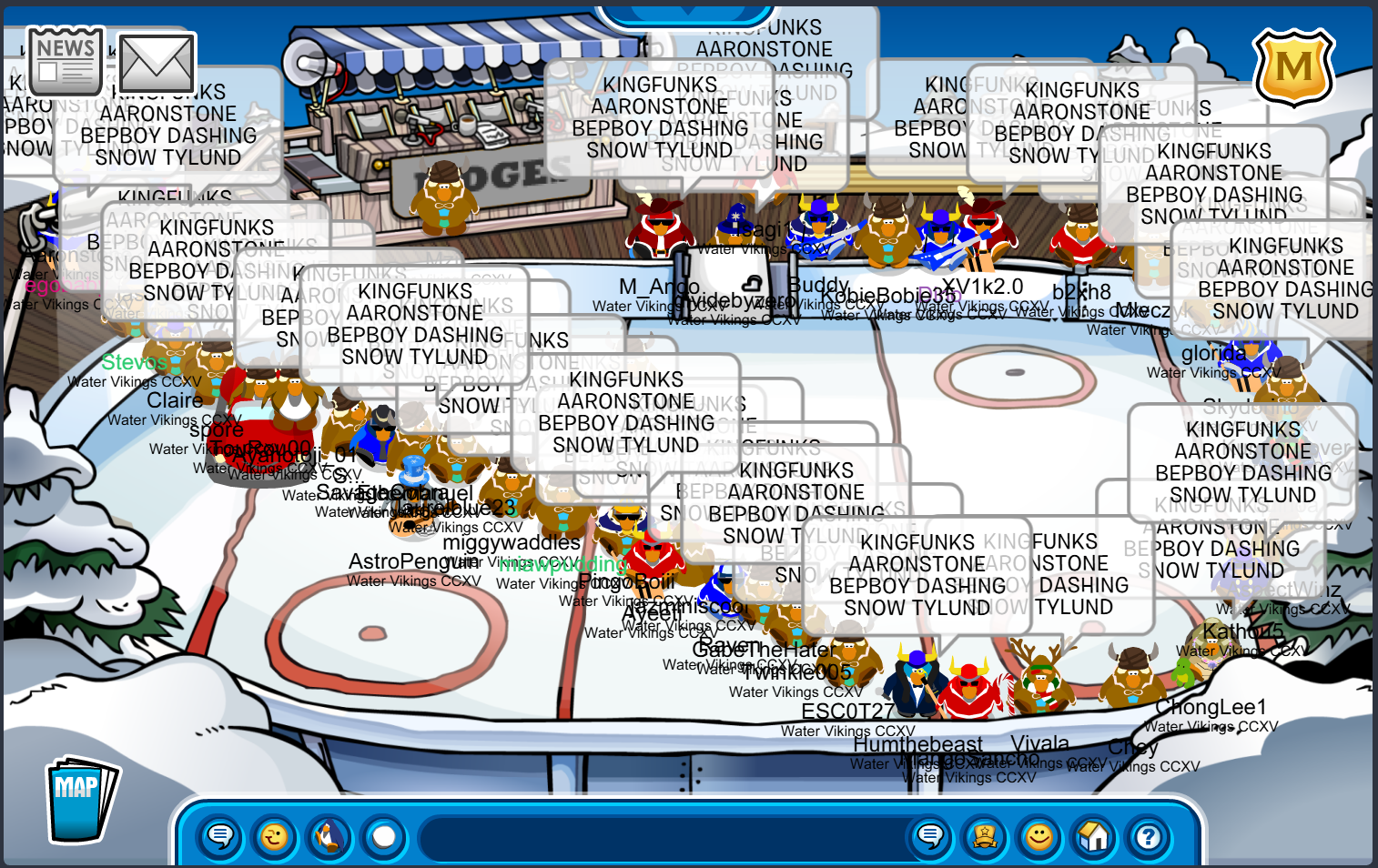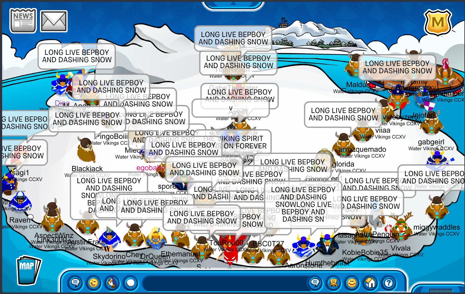 Good morning, afternoon, or evening, Water Vikings! Today we had a very special event; the first in our 15th Anniversary Celebration. We logged on to Frostbite in rooms Iceberg, Town, Underground Pool, Stadium, Snow Forts, and the Dojo. This event in particular celebrated the Blue Summer of 2013, of which we replicated certain forms and event pictures. It was also quite special as the Viking Pantheon/WV Legend as well as Discord server owner, HCOV head and man of many more accolades led the event—teaching all of us about some WV history too.