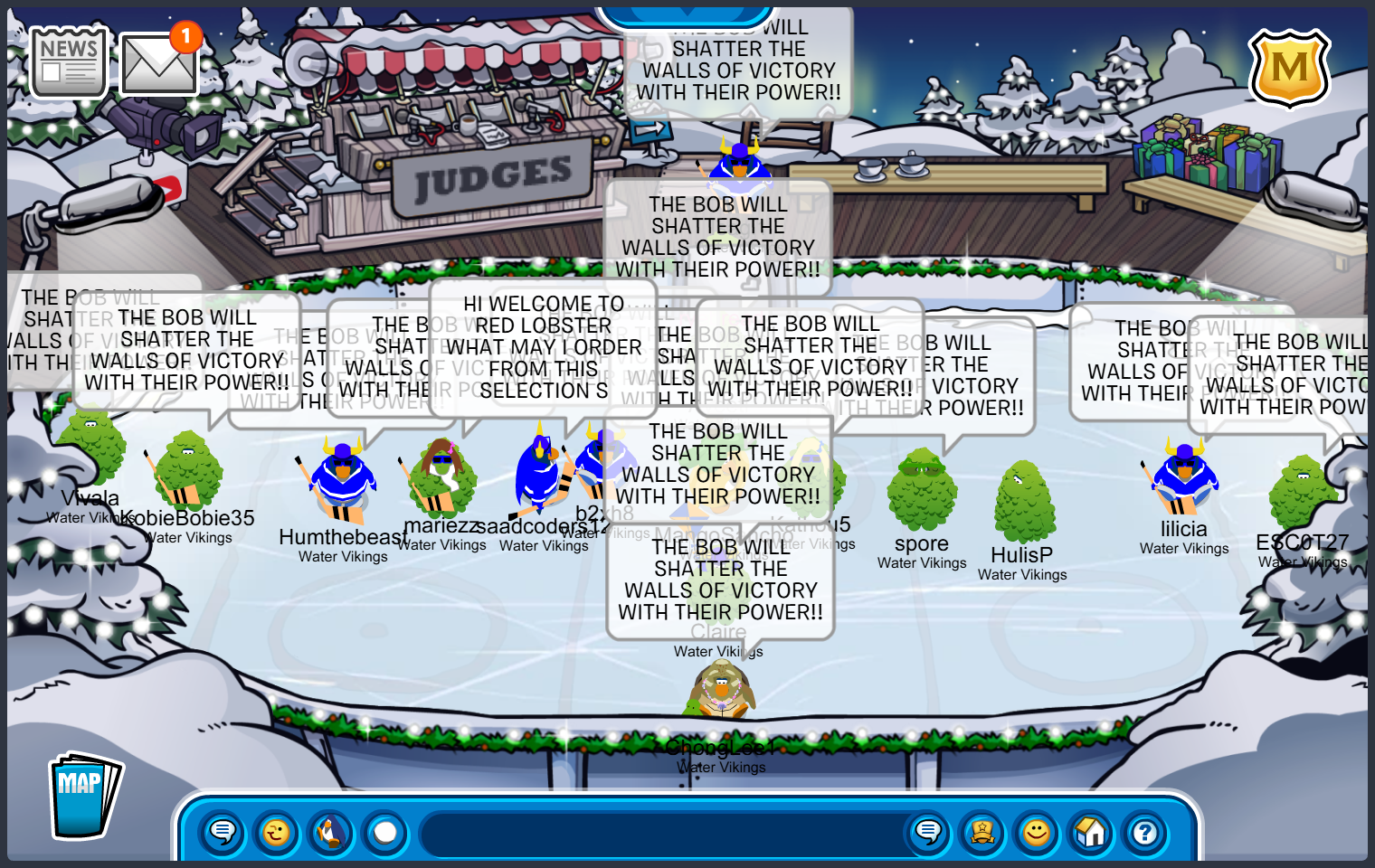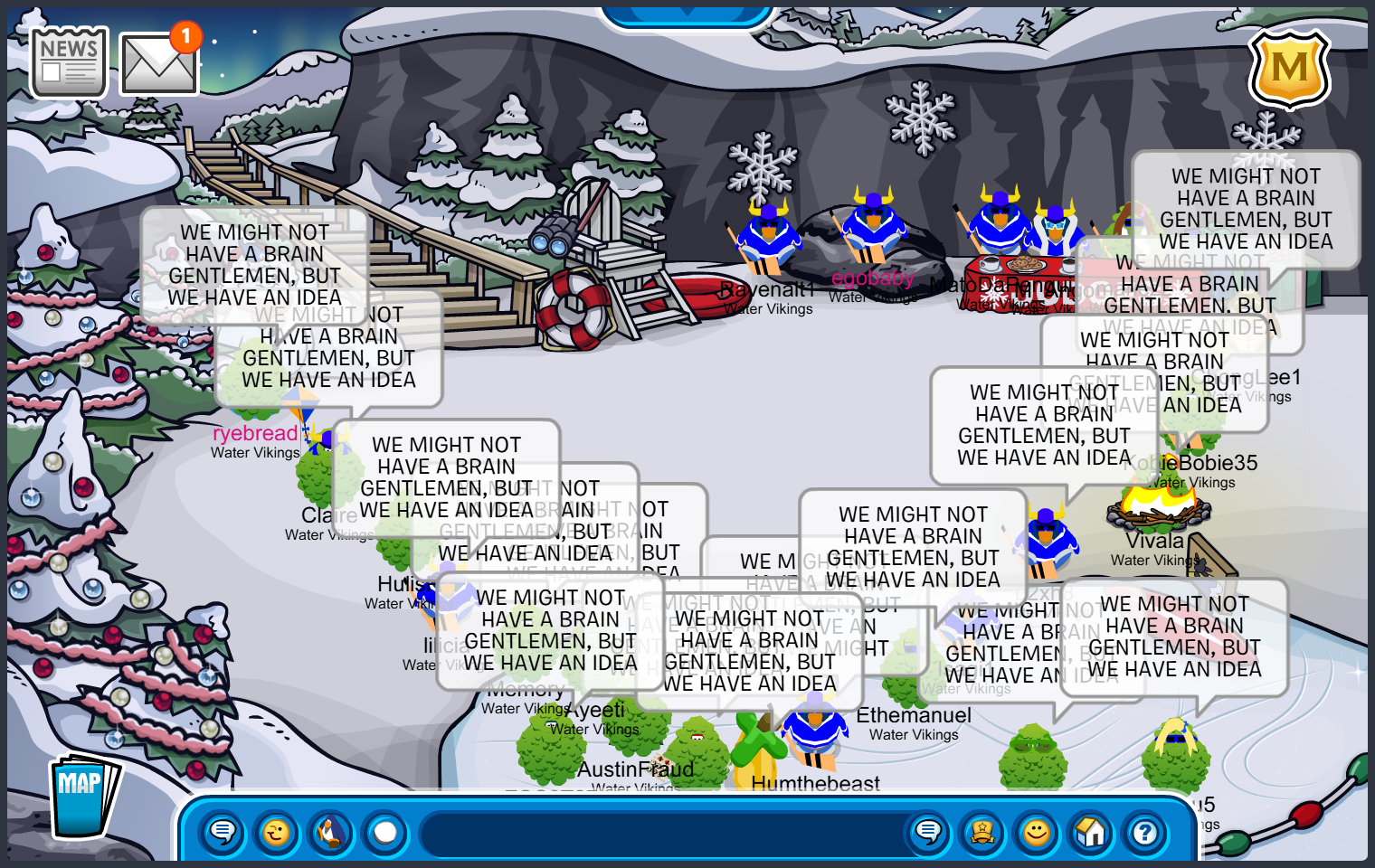 Frostbite, Water Vikings Capital — Good Afternoon Everyone! Today we logged on to Icebreaker, Cove then we went to the Stadium so we can train on our formations, tactics etc. in preparation for the tournament upcoming called March Madness. We also have dressed up as a slime so we can honor our king called Bob. For those who don’t know who bob is, he is a meme on the internet that is known for his funny jokes while being a blue slime. Every Water Viking Member has done great! they all have been wake and done amazing formations along with tactics! Good job WV! lets win March Madness!
