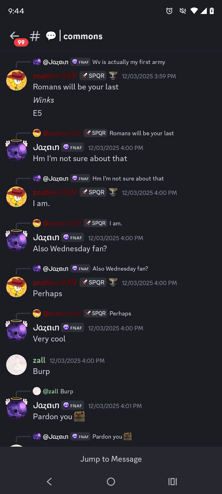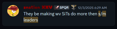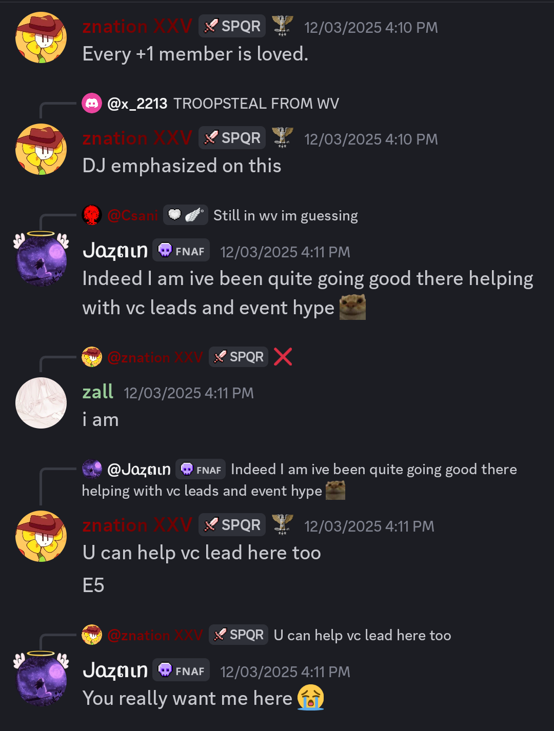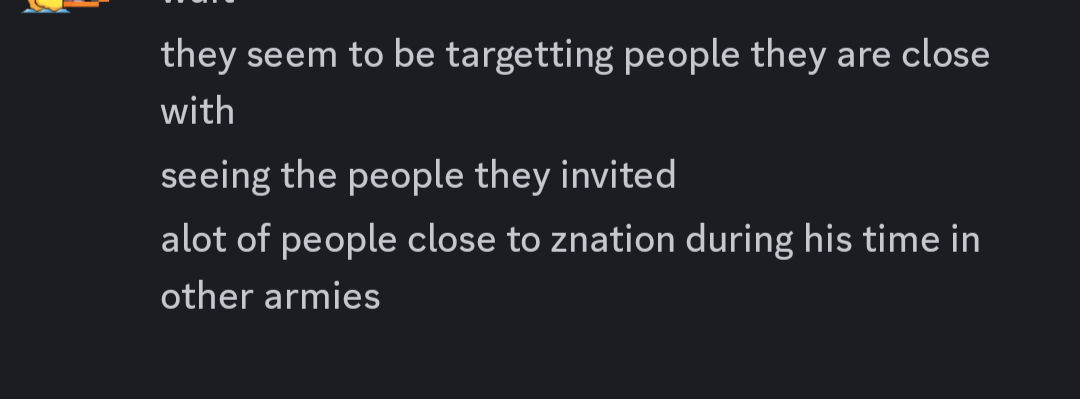 A few months later, Dj abruptly leaves the community but mistakenly leaves Romans alive under the hands of Znation. Znation was thrown into a very stressful position and underprepared, and honestly we felt bad for the kid. He was eventually saved by Smurf and Twitchy and Romans preformed much better when Dj was out of the picture. They helped Znation to get comfortable in leading. It appears he got too comfortable. We were notified of a conversation Znation was having with a ranking Water Viking troop, asking her to fulfil staff duties in Romans for him. He also continued to try to get her into Romans, and practically begged her to be apart of his ranks despite her stating multiple times she was a loyal Water Viking. This was immediately sent to Twitchy, and the conversation was put to a stop. Twitchy apologized to the leadership and reassured us this will not happen again.