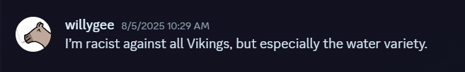 A few weeks after the poor attempt of troop stealing, a former Romans leader comes into the main chat and begins harassing one of our dearest troops for being a Water Viking. Went as far to call him disgusting, and to tell him Water Vikings are lame!