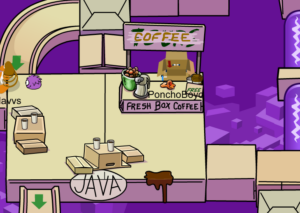 Move to the right and then take a detour upwards until you find a little coffee shop. To the right, it has a tiny “Free” sign ahead of a decaf coffee. You now have a free decaf coffee.