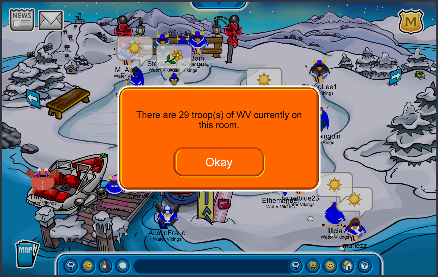 Frostbite, Water Vikings Capital — Good Afternoon Water Vikings! Today we Logged on to Icebreaker Iceberg, then we went to the Stadium, then Docks, then Book Room, then Agent Room and finally the Ski Hill. The purpose of this is because Today we celebrated the 15th year anniversary of the Water Vikings with along some veterans in the current era. Every Water Viking Member has done outstanding by doing cool tactics and even creative and unique forms. Good Job WV! Keep it up and get ready for March Madness!